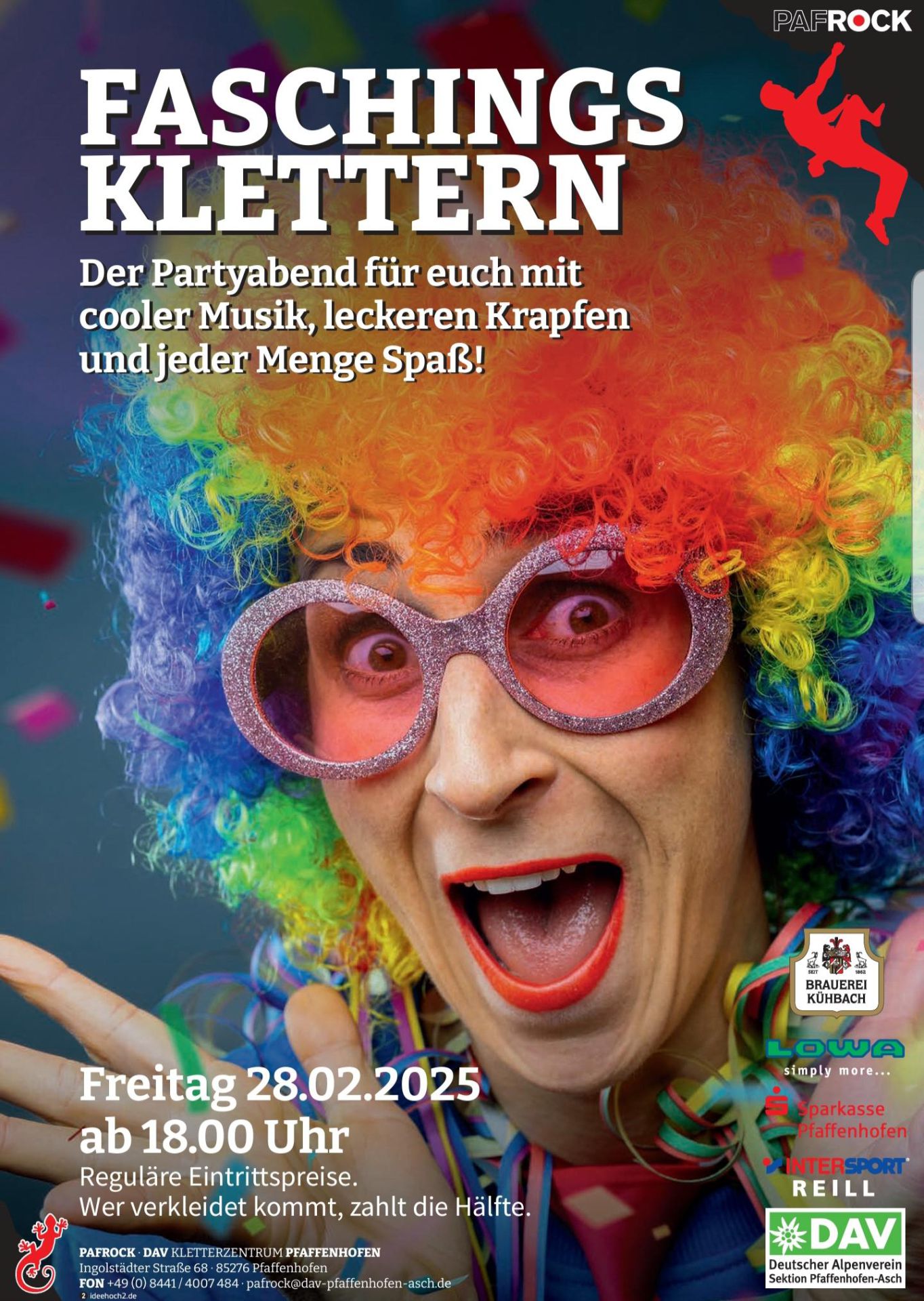 Die Kletterhalle PAFRock der DAV-Sektion Pfaffenhofen-Asch veranstaltet auch dieses Jahr wieder das beliebte Faschingsklettern. Der Partyabend für euch mit cooler Musik, leckeren Krapfen und jeder Menge Spaß!