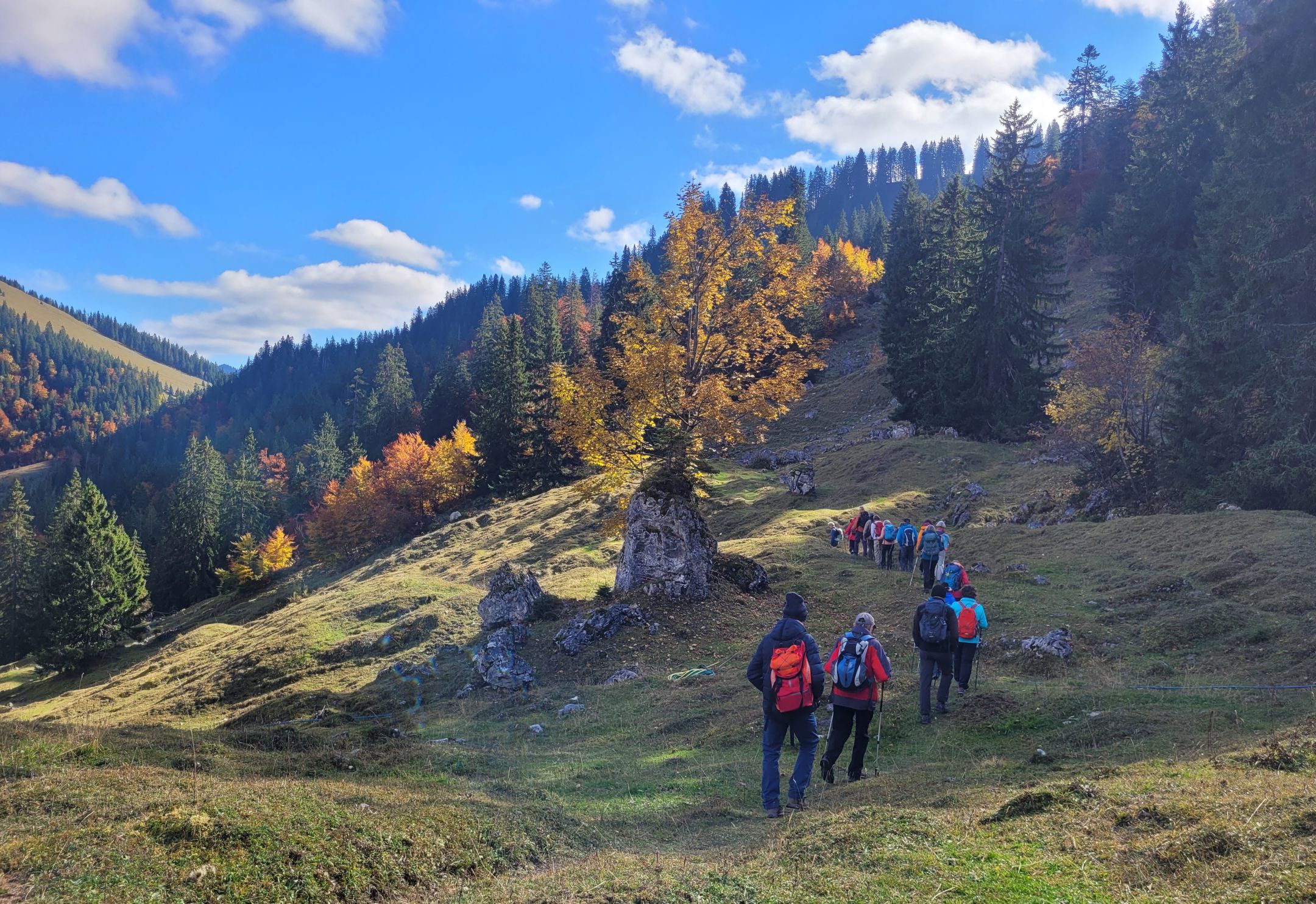 Einen „Goldenen Oktobertag“ konnte die Wandergruppe der Alpenvereinsektion PAF-Asch am Samstag in den Schlierseer Bergen geniessen. Vom Spitzingsee erfolgte der Aufstieg über die Obere Firstalm zum Bodenschneidhaus. Nach der Einkehr führte uns der Weg über die Freudenreichalm hinunter nach Neuhaus am Schliersee. Bei dieser farbenprächtigen Tour wurde uns einmal mehr bewusst, wie schön es bei uns in Bayern ist. Organisiert wurde diese Tour von DAV-Wanderleiter Jakob Kraft.