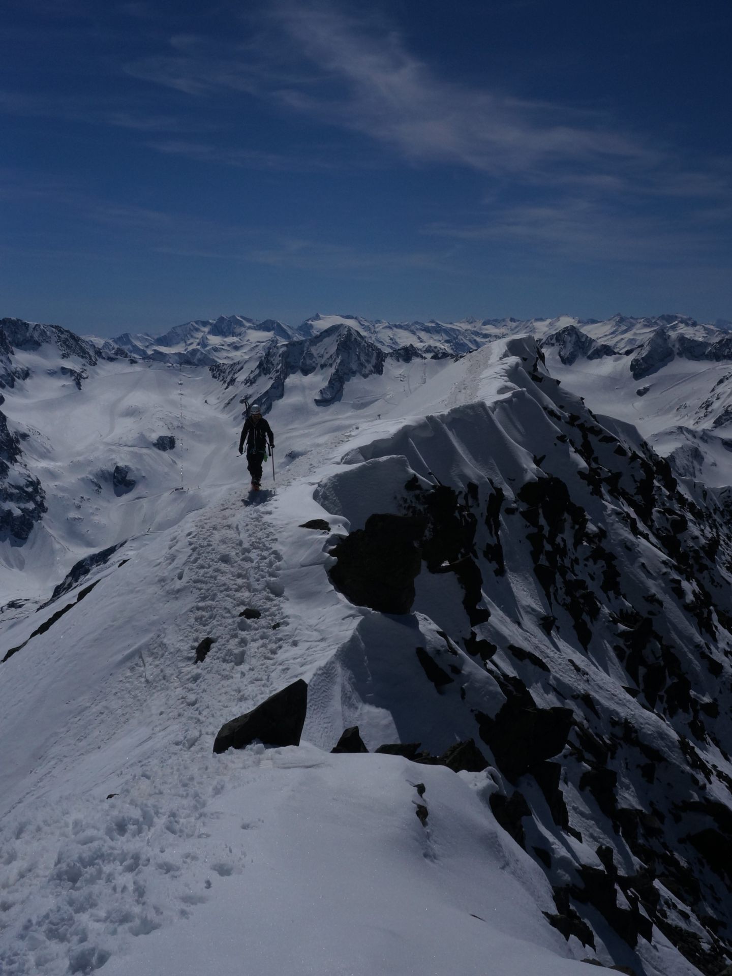 In Anbetracht dieser Situation wurde die Tour durch die beiden Trainer Udo Weißflog und Markus Friedrich kurzfristig umdisponiert und die Franz-Senn-Hütte in den Stubaier Alpen als Alternativziel auserkoren. Nach der gemeinschaftlichen Anreise im Vereinsbus wurden am Freitag noch in unmittelbarer Hüttennähe die LVS- und Spaltenbergungskenntnisse der 8-köpfigen Gruppe aufgefrischt, sodass am folgenden Samstag gut vorbereitet die Ruderhofspitze ins Visier genommen werden konnte. Nach dem Aufstieg über den Gletscher „Alpeiner Ferner“ erreichten dann alle Teilnehmer nach fünf Stunden den vierthöchsten Gipfel der Stubaier Alpen. Den teilweise ausgesetzten Gipfelgrat ging es zurück zum Skidepot und von dort in leichten Schwüngen wieder 1400 Höhenmeter hinab zur sonnenbeschienenen Terrasse der Hütte. Manchmal bedarf es halt einfach des notwenigen Quäntchen Glückes.