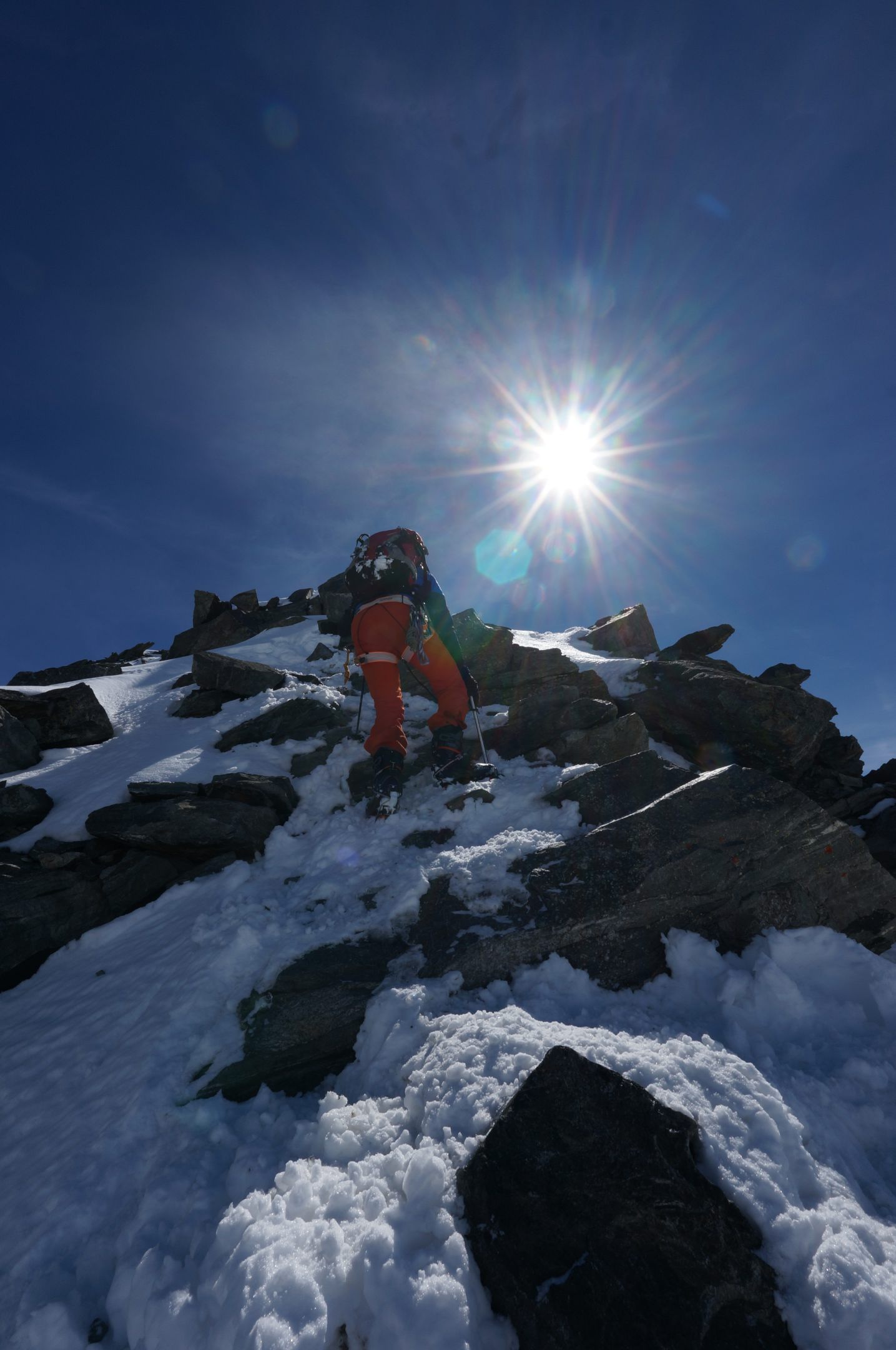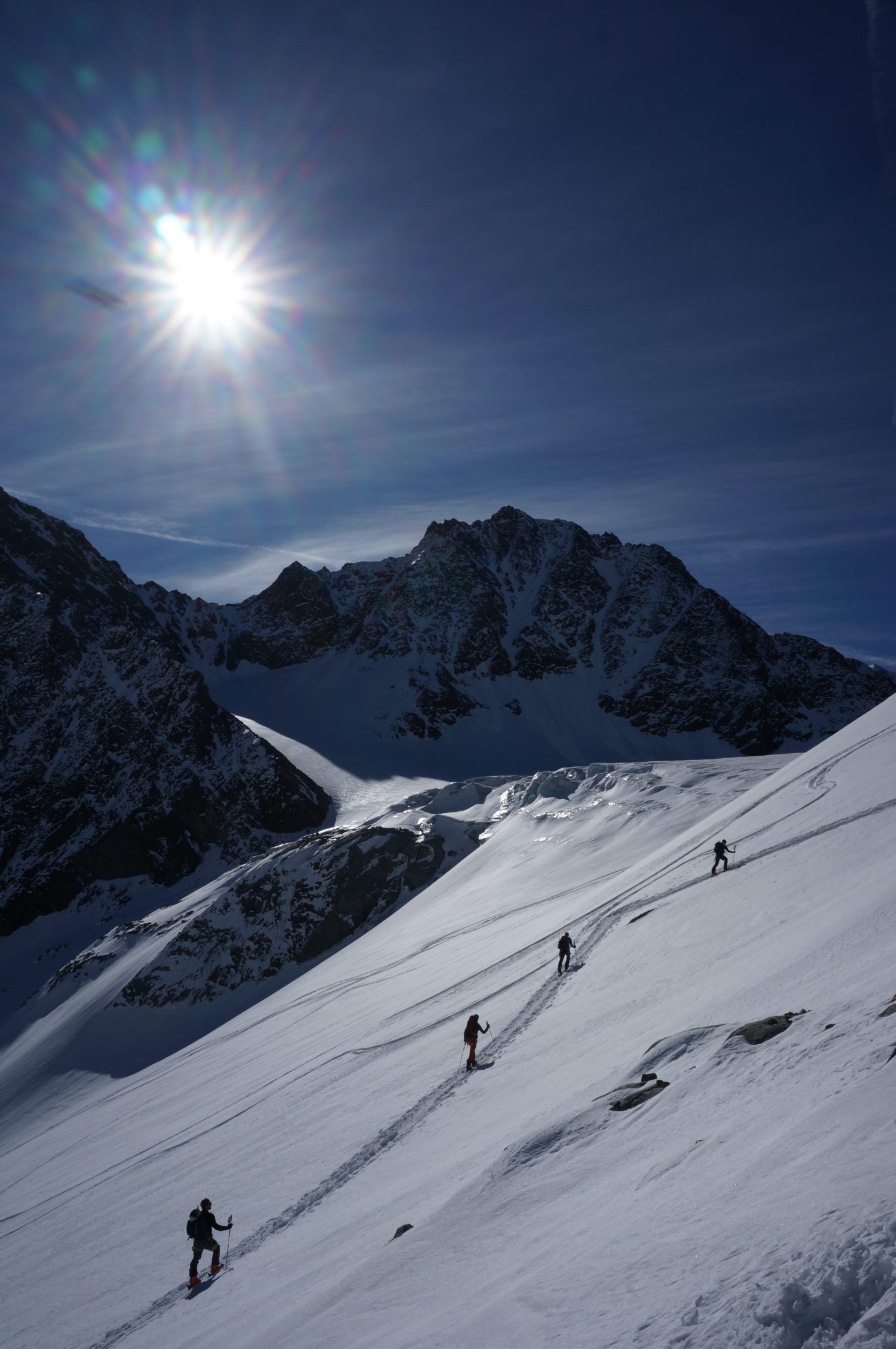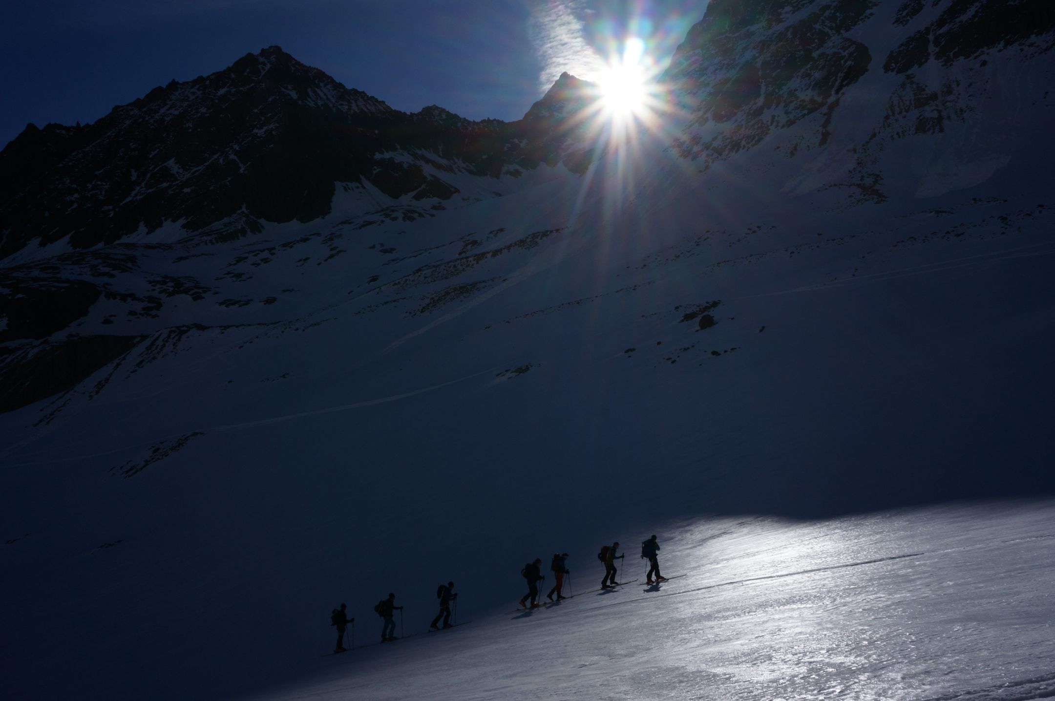 In Anbetracht dieser Situation wurde die Tour durch die beiden Trainer Udo Weißflog und Markus Friedrich kurzfristig umdisponiert und die Franz-Senn-Hütte in den Stubaier Alpen als Alternativziel auserkoren. Nach der gemeinschaftlichen Anreise im Vereinsbus wurden am Freitag noch in unmittelbarer Hüttennähe die LVS- und Spaltenbergungskenntnisse der 8-köpfigen Gruppe aufgefrischt, sodass am folgenden Samstag gut vorbereitet die Ruderhofspitze ins Visier genommen werden konnte. Nach dem Aufstieg über den Gletscher „Alpeiner Ferner“ erreichten dann alle Teilnehmer nach fünf Stunden den vierthöchsten Gipfel der Stubaier Alpen. Den teilweise ausgesetzten Gipfelgrat ging es zurück zum Skidepot und von dort in leichten Schwüngen wieder 1400 Höhenmeter hinab zur sonnenbeschienenen Terrasse der Hütte. Manchmal bedarf es halt einfach des notwenigen Quäntchen Glückes.