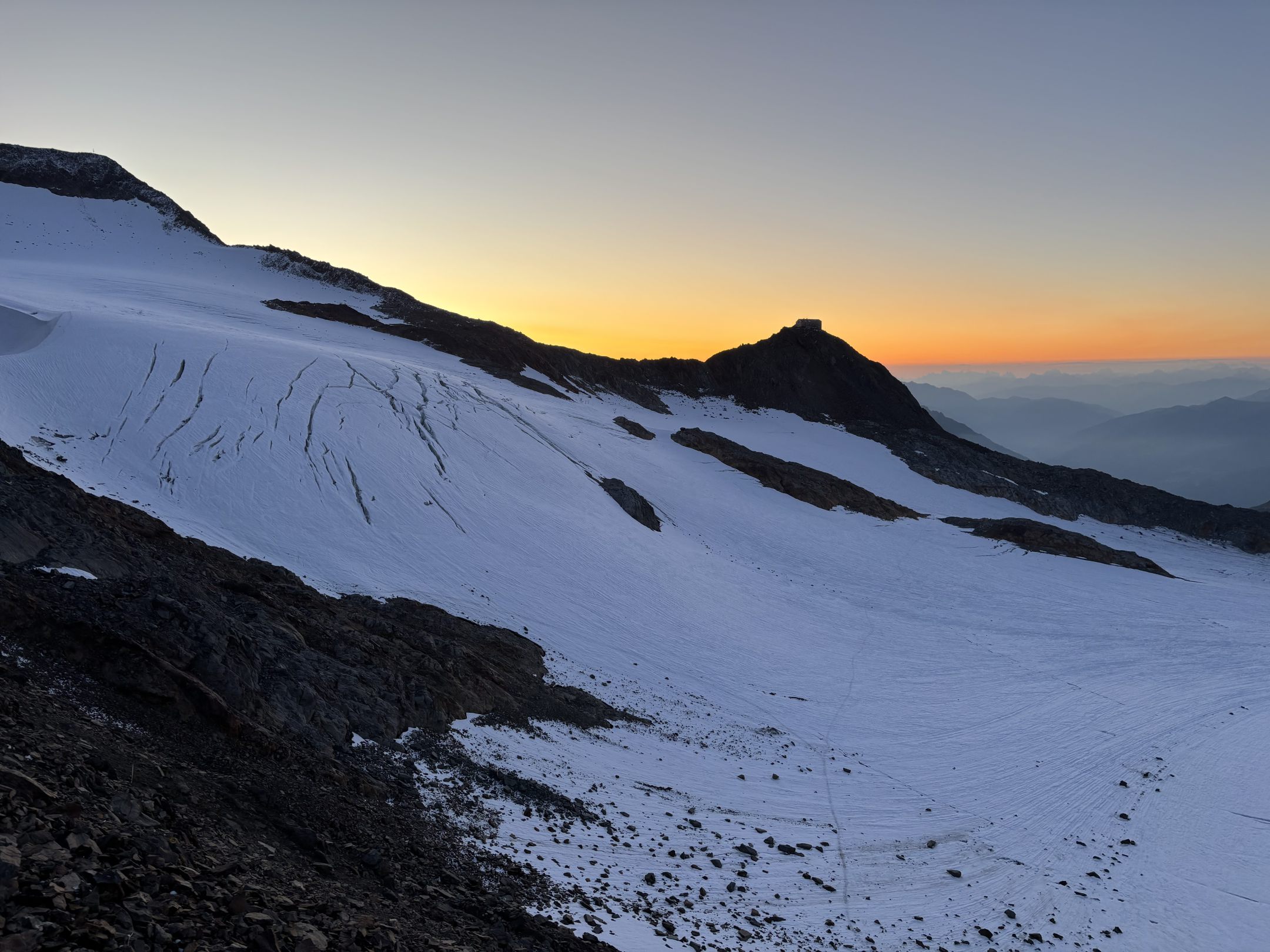 Nach dem Abstieg über Firnfelder und Blockgelände erreichten wir am Nachmittag die Müllerhütte – ein Ort für alpine Gemütlichkeit und Austausch. Der Übergang zum Wilden Pfaff am nächsten Tag führte über einen eindrucksvollen Grat mit festen Felsstrukturen und teils ausgesetzten Passagen. Der Gipfelanstieg war technisch unschwierig, doch der Ausblick auf Zuckerhütl und Wildspitze war schlicht überwältigend.